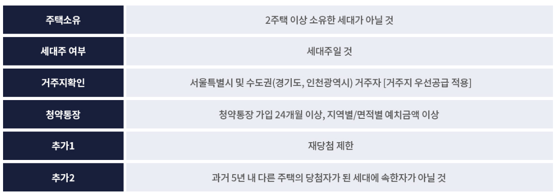 1. 만 19세 이상 무주택 세대주로써, 세대원 전원 5년 내 청약 당첨 사실이 없어야 합니다. 또한, 서울 2년이상 연속거주 요건이 있습니다.
