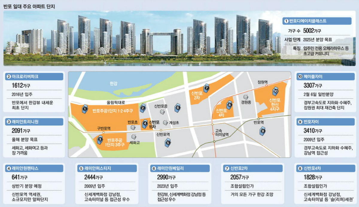 반포 주공 1단지 1,2,4주구를 통합 재개발하는 반포디에이치클래스트과 맞닿아 있어 생활 인프라를 공유하고 있어 반포디에이치클레스트 5000세대, 래미안 트리니원 2000세대 통합 7,000세대의 시너지 효과가 기대됩니다.